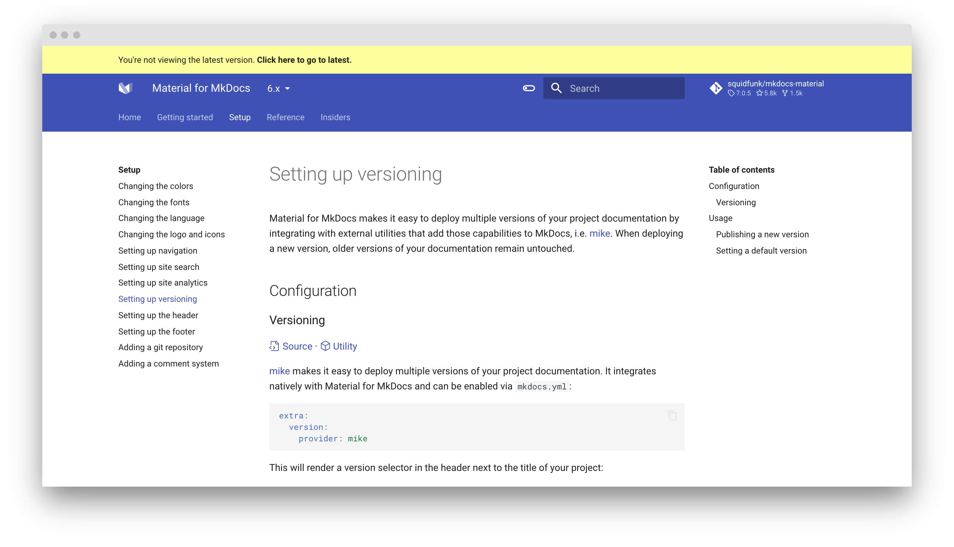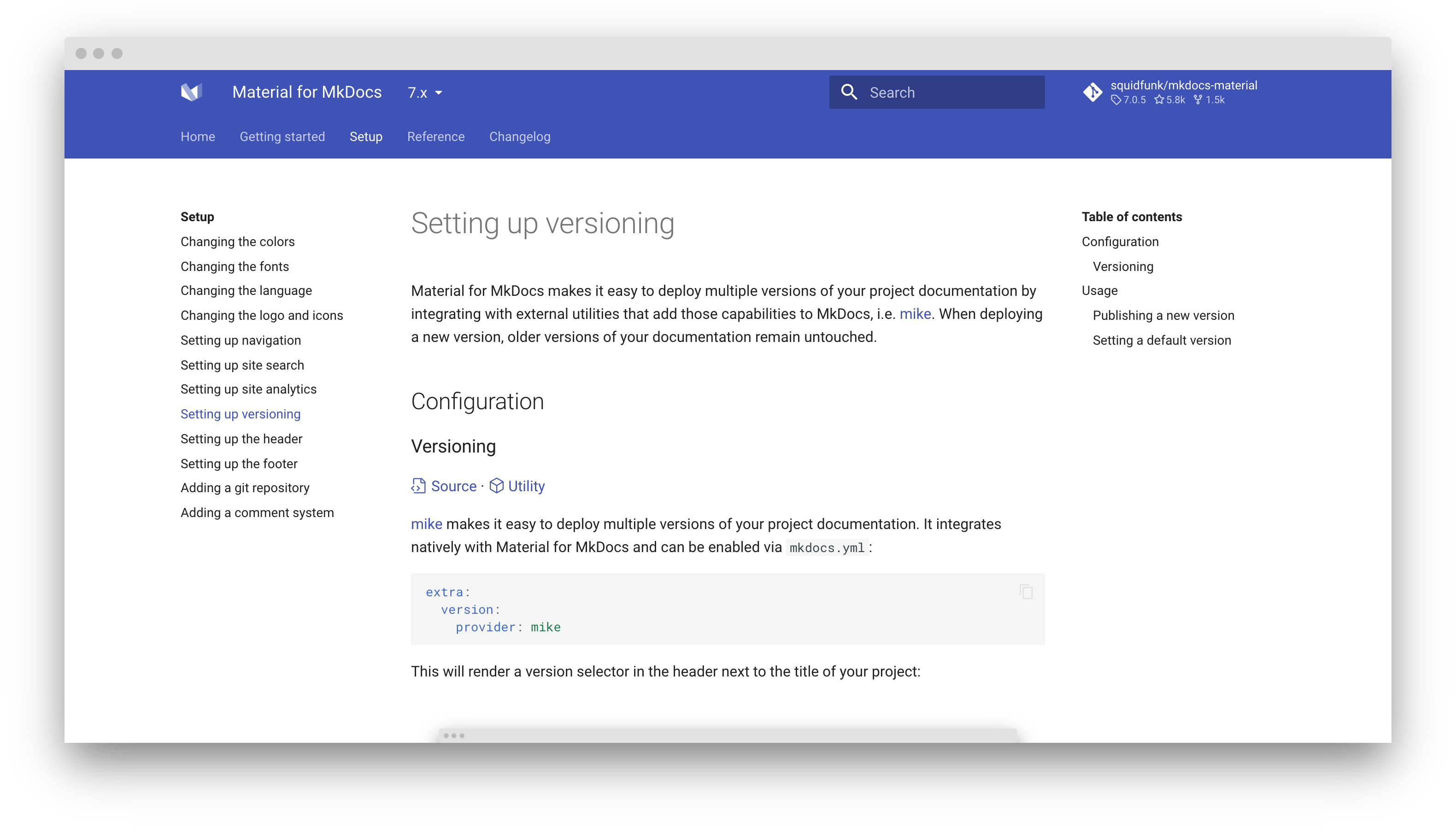 mike makes it easy to deploy multiple versions of your project documentation. It integrates natively with Material for MkDocs and can be enabled via mkdocs.yml